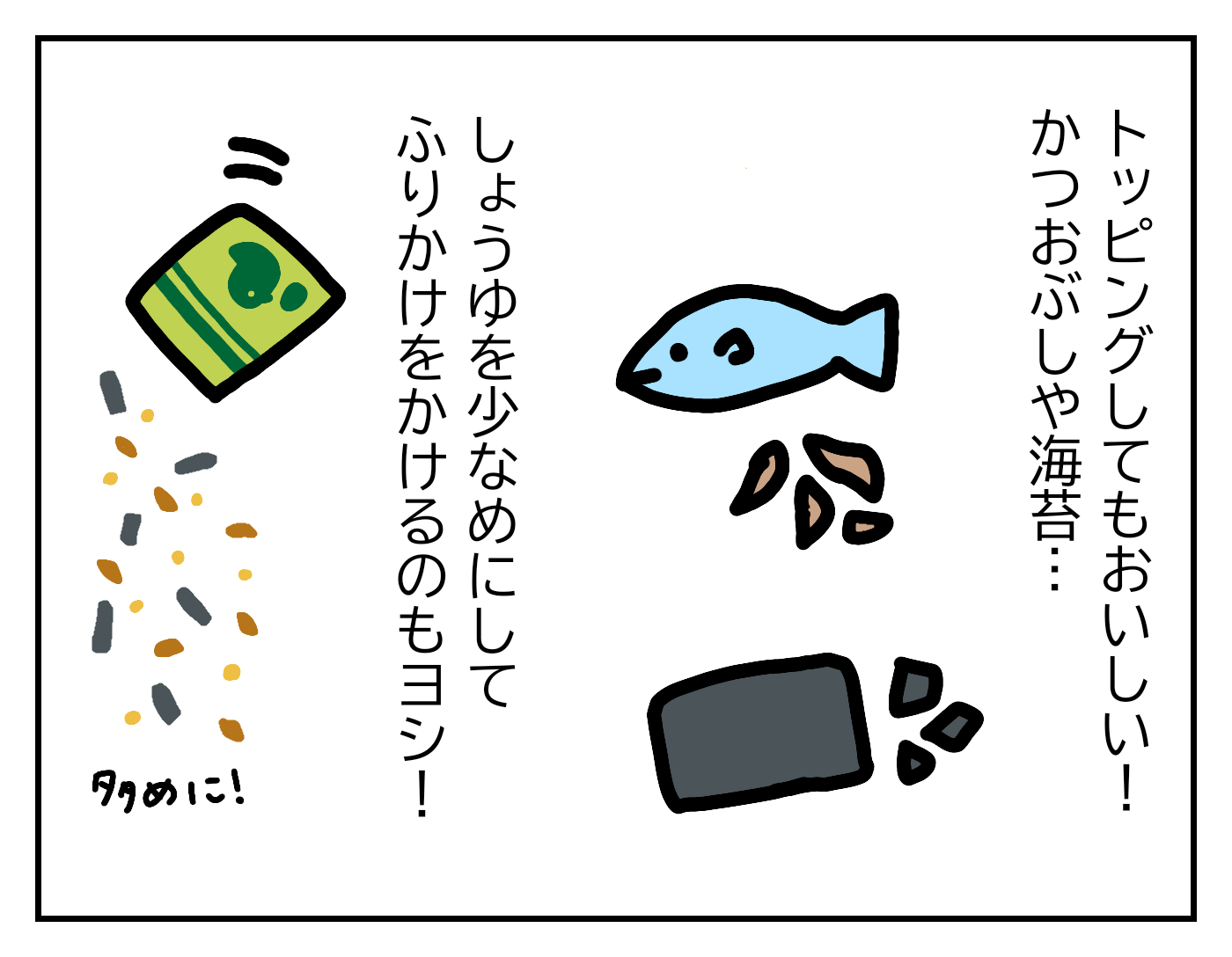 ちょっとしょうゆを少なめにして、お好きなふりかけをザザッとかけるのもおいしいです!!(ザクザク食感になります!)